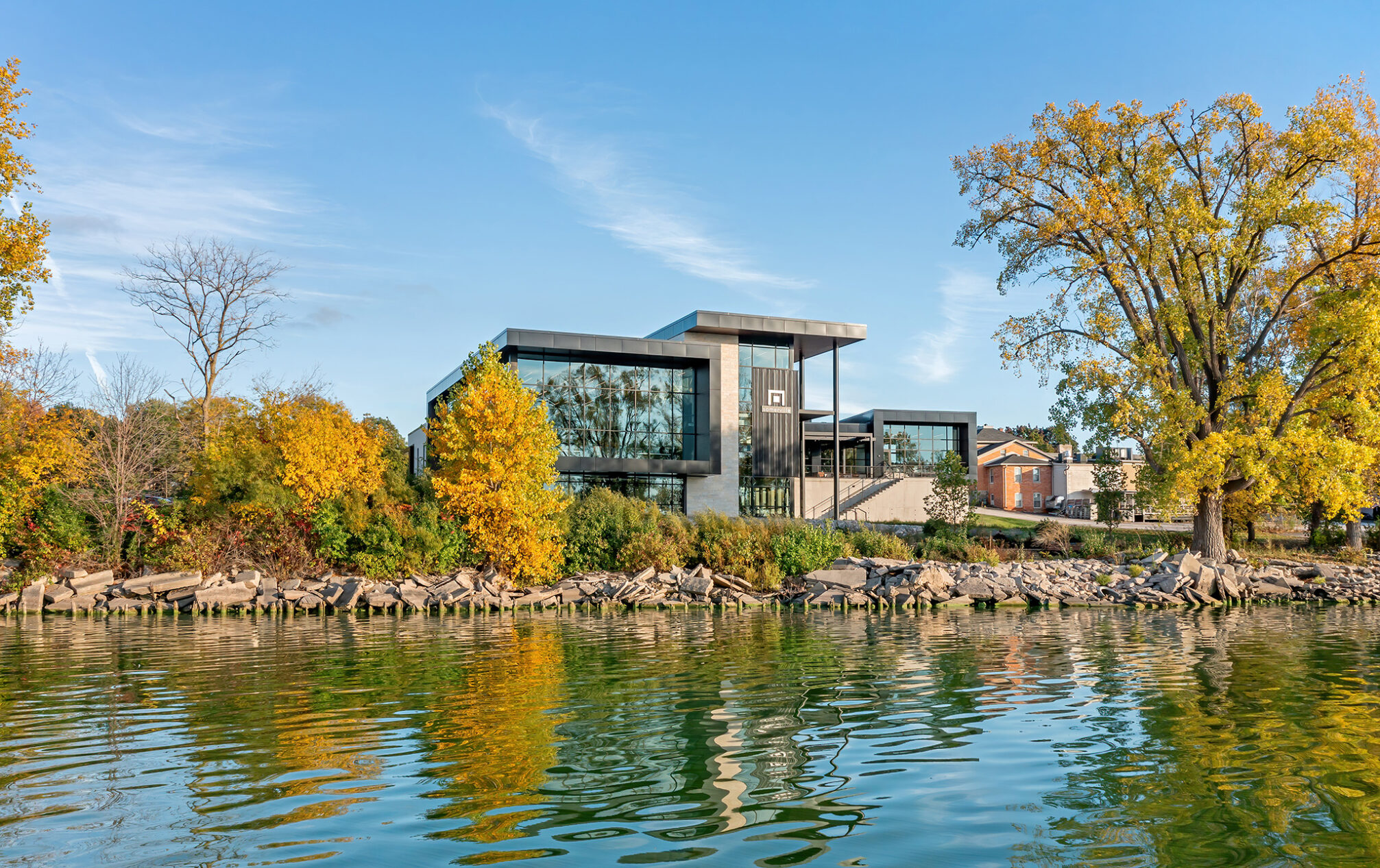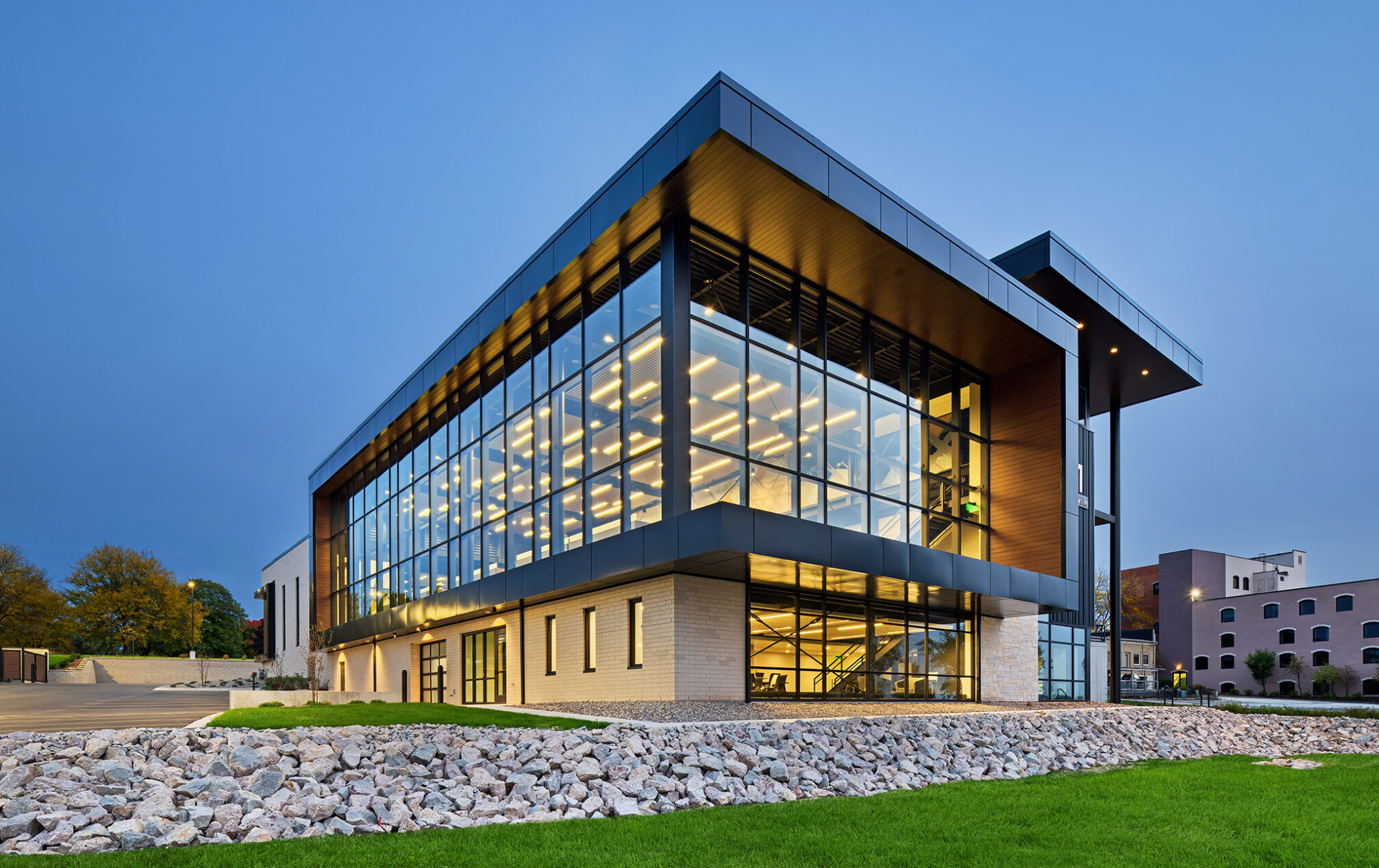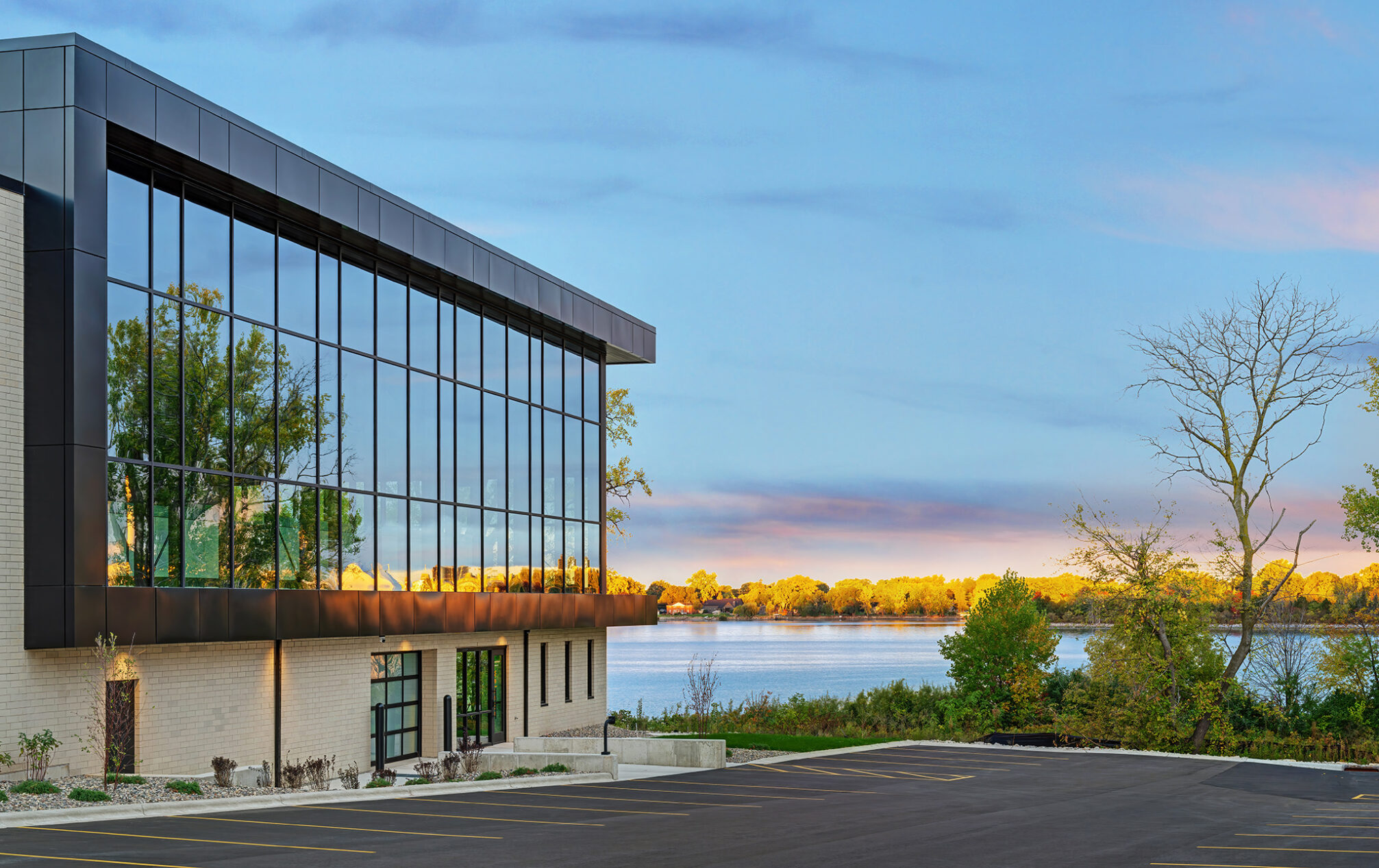 With captivating views of the Fox River and a glimpse of Lambeau Field, our new building connects us to the surrounding landscape in a truly inspiring way. A timeless material and color palette of natural stone, brick and wood-look metal wall panels complement the scenic setting.