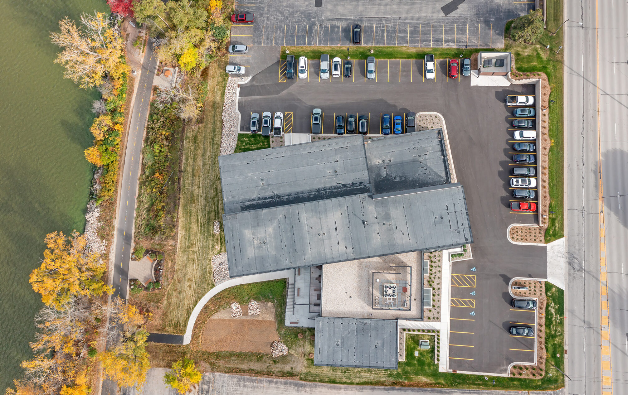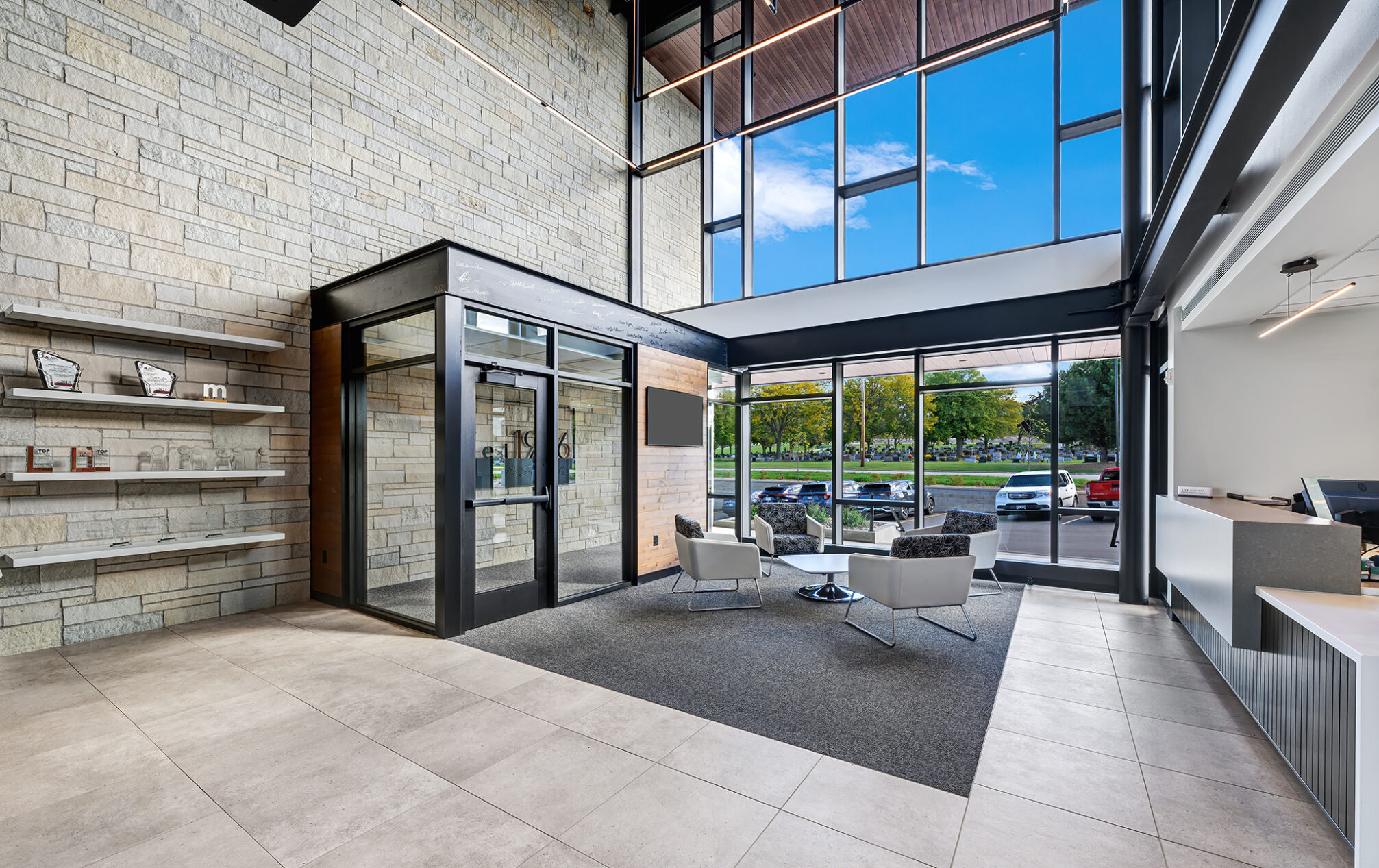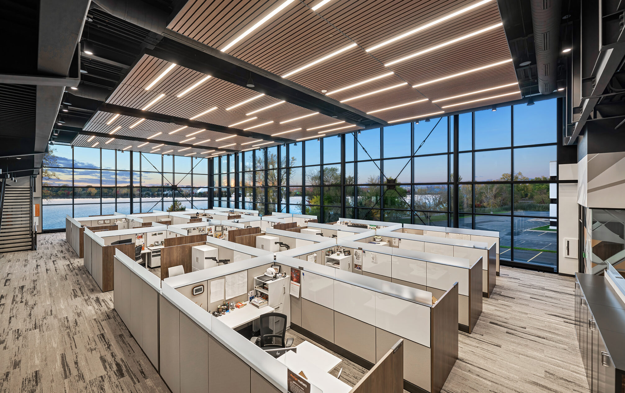 With captivating views of the Fox River and a glimpse of Lambeau Field, our new building connects us to the surrounding landscape in a truly inspiring way. A timeless material and color palette of natural stone, brick and wood-look metal wall panels complement the scenic setting.