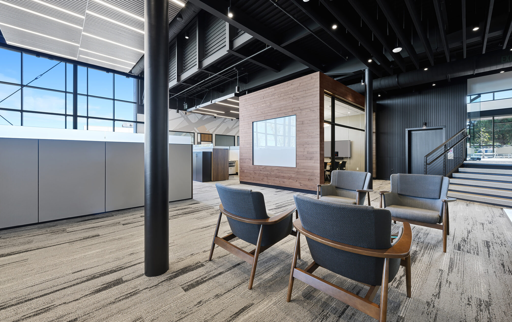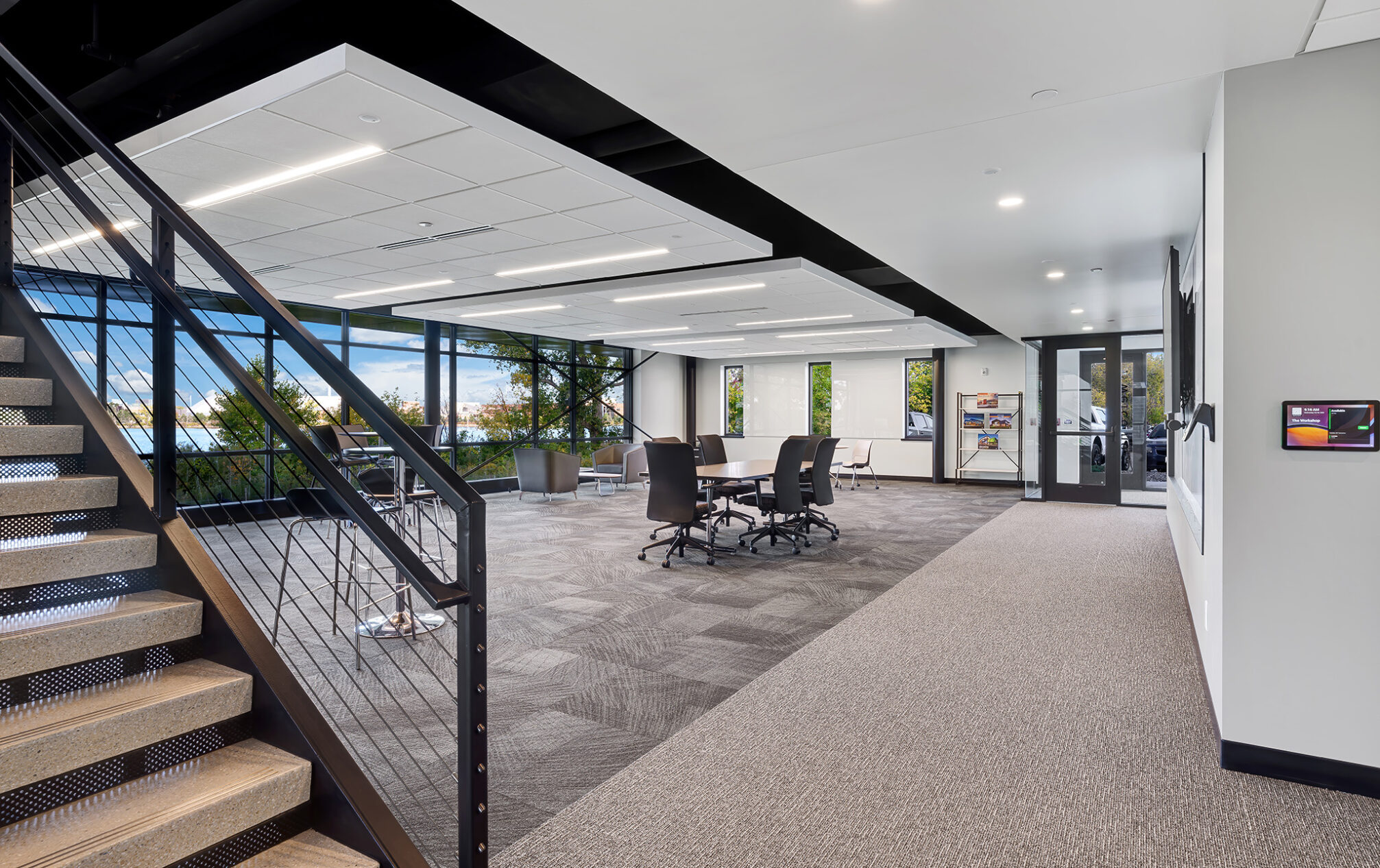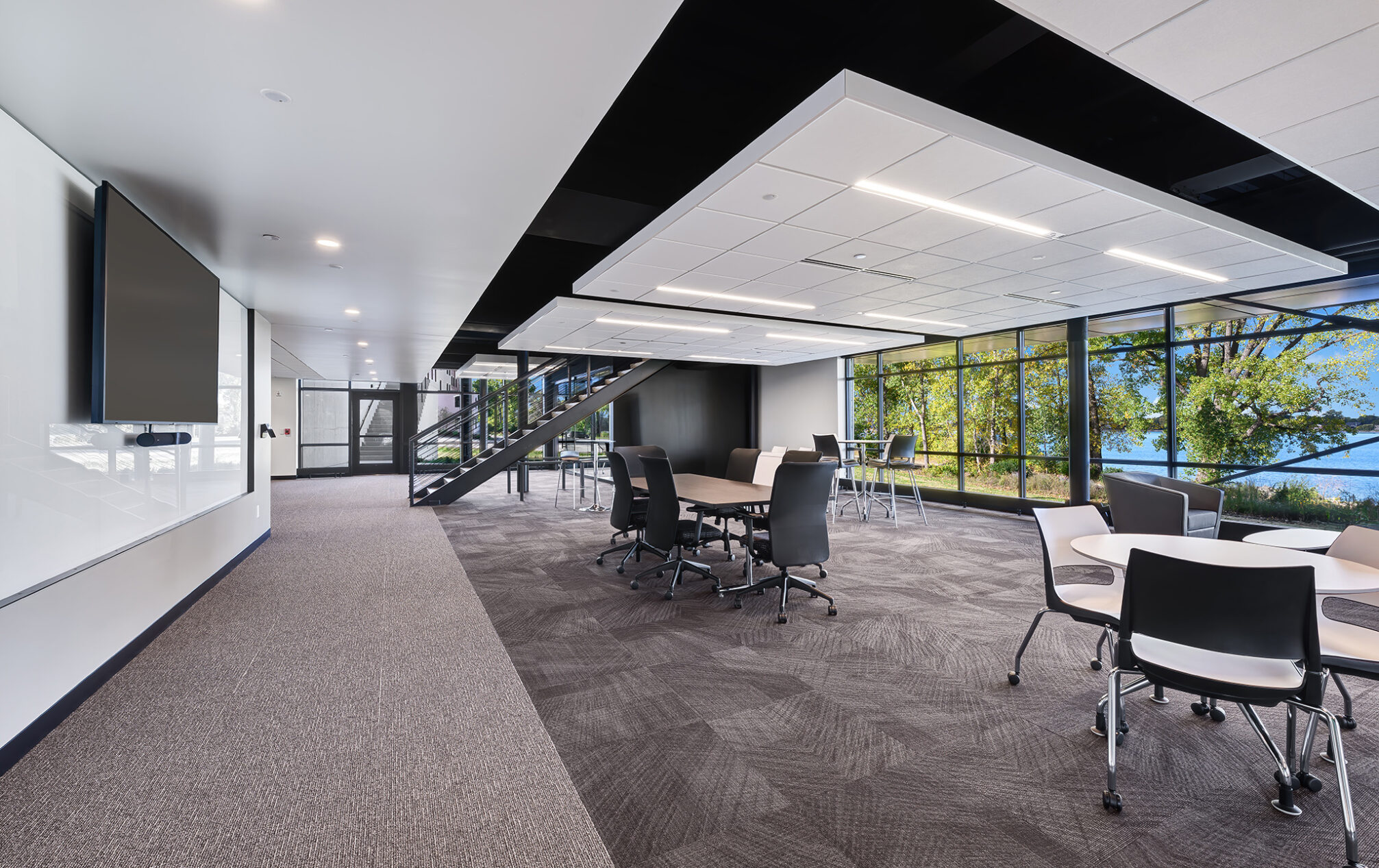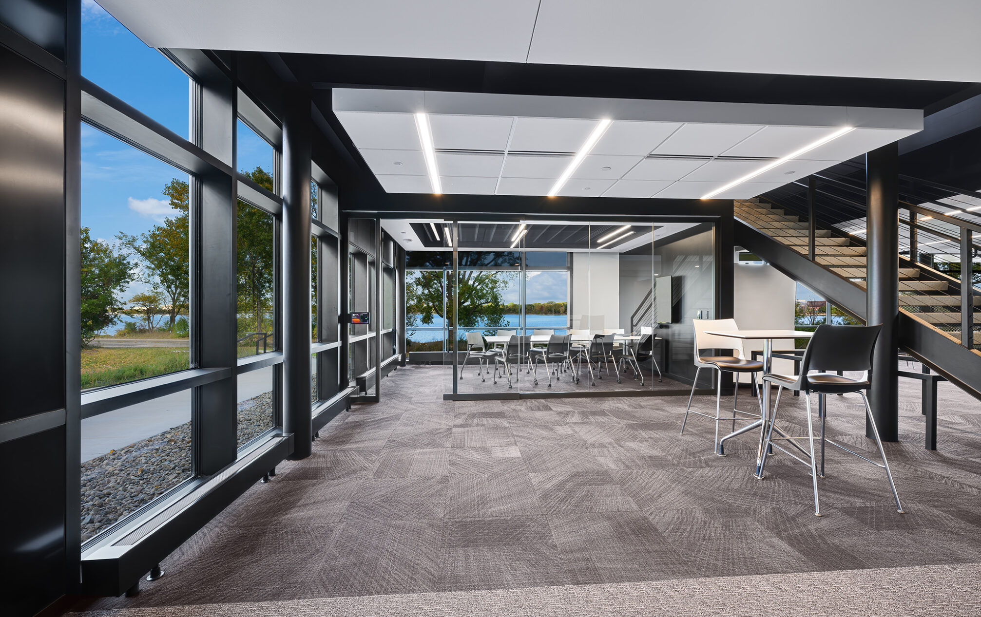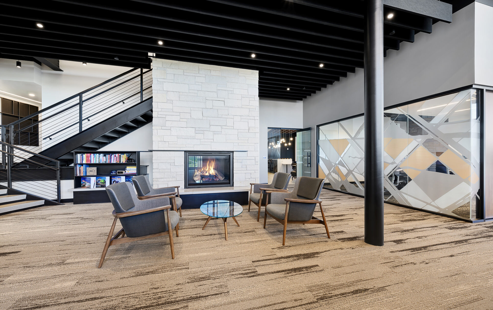 The design incorporates eight private meeting rooms and two large gathering spaces to facilitate communication and teamwork. The breakroom/café, with access to the outdoor terrace, offers a perfect spot for relaxation and informal meetings. A cozy fireplace with casual seating opportunities adds a touch of warmth and comfort to our workspace.