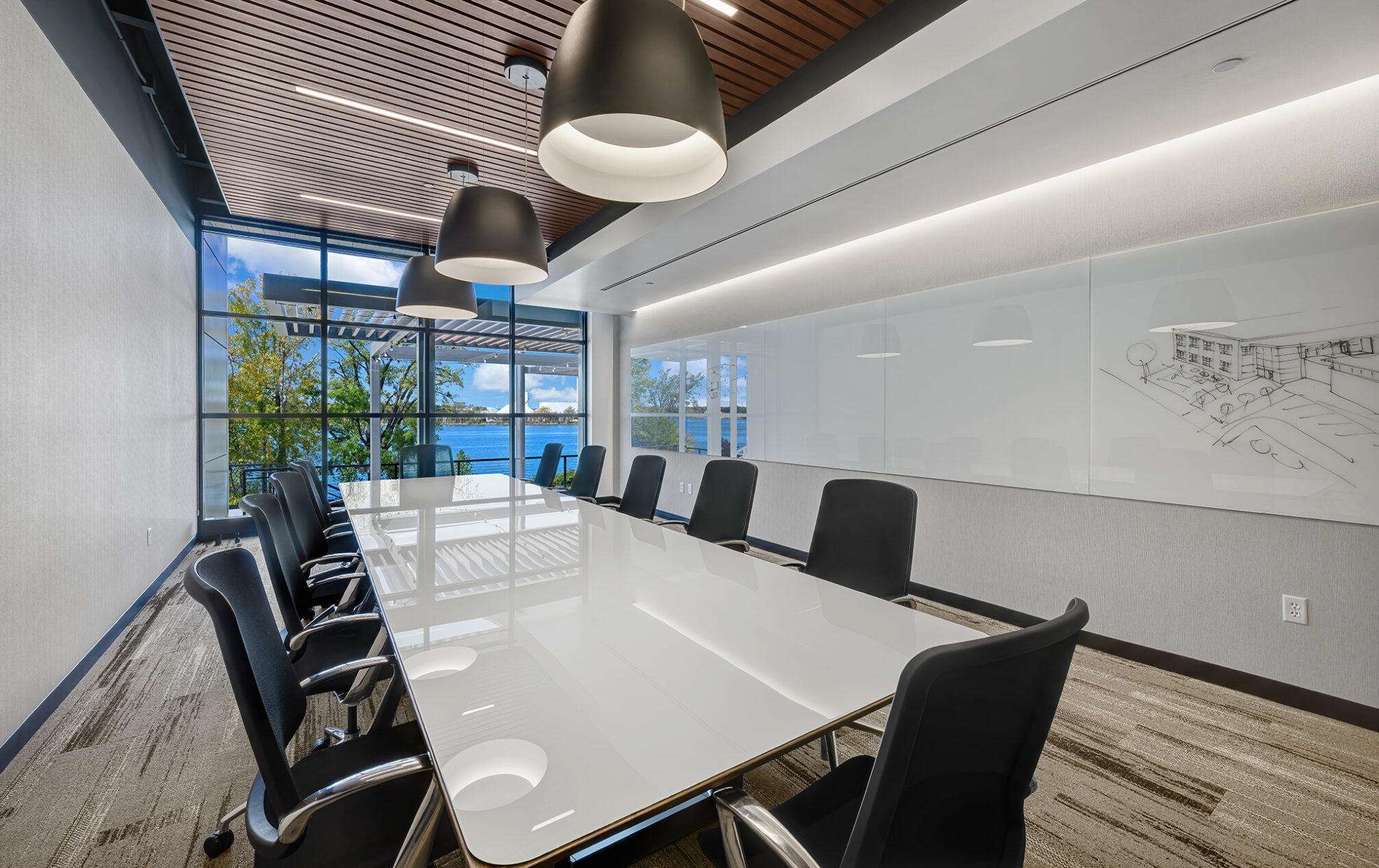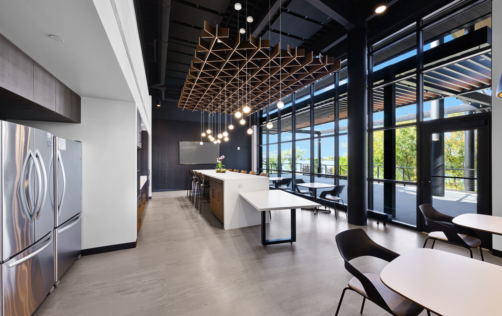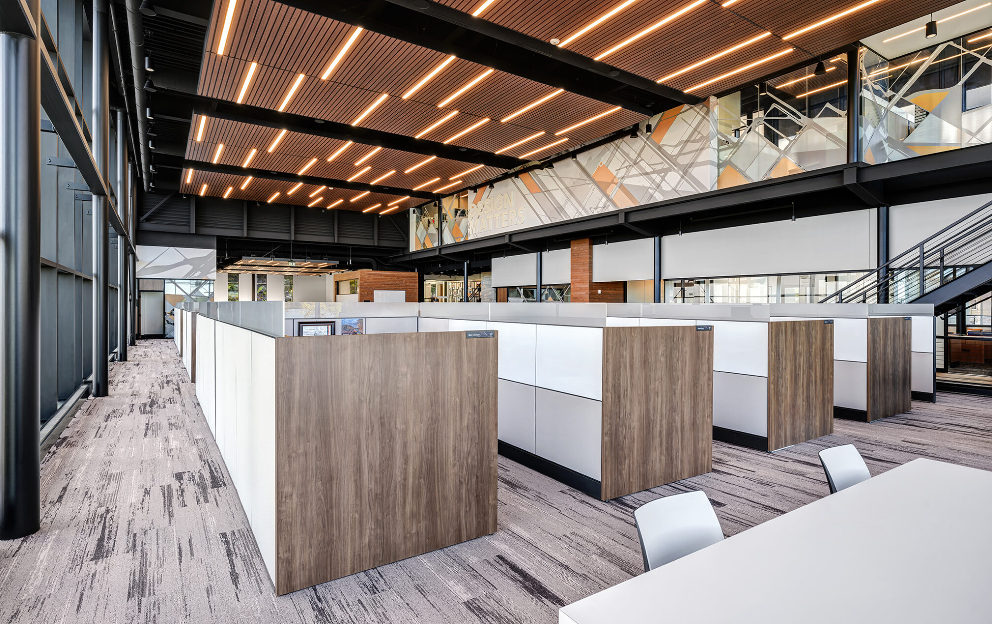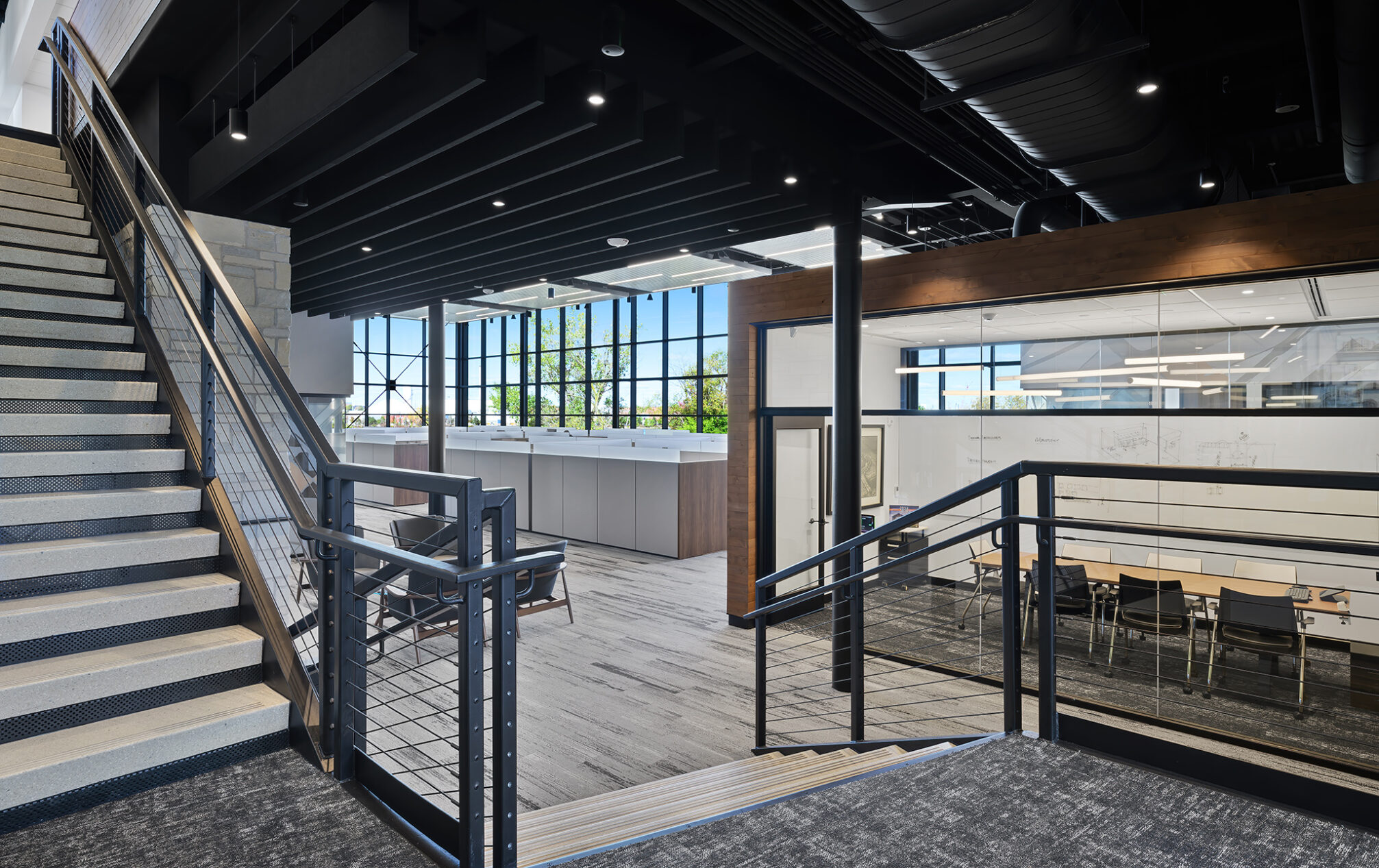 The design incorporates eight private meeting rooms and two large gathering spaces to facilitate communication and teamwork. The breakroom/café, with access to the outdoor terrace, offers a perfect spot for relaxation and informal meetings. A cozy fireplace with casual seating opportunities adds a touch of warmth and comfort to our workspace.