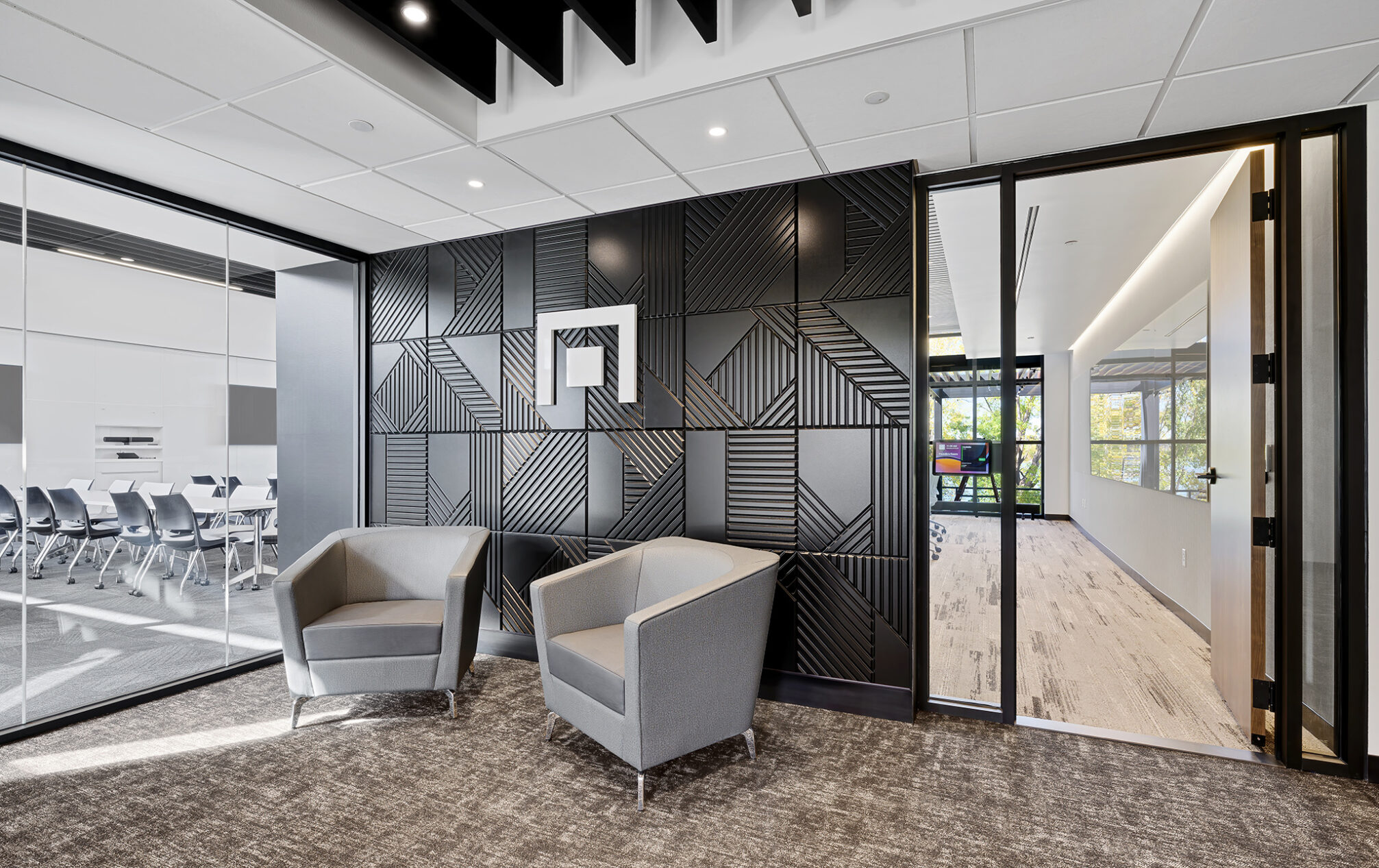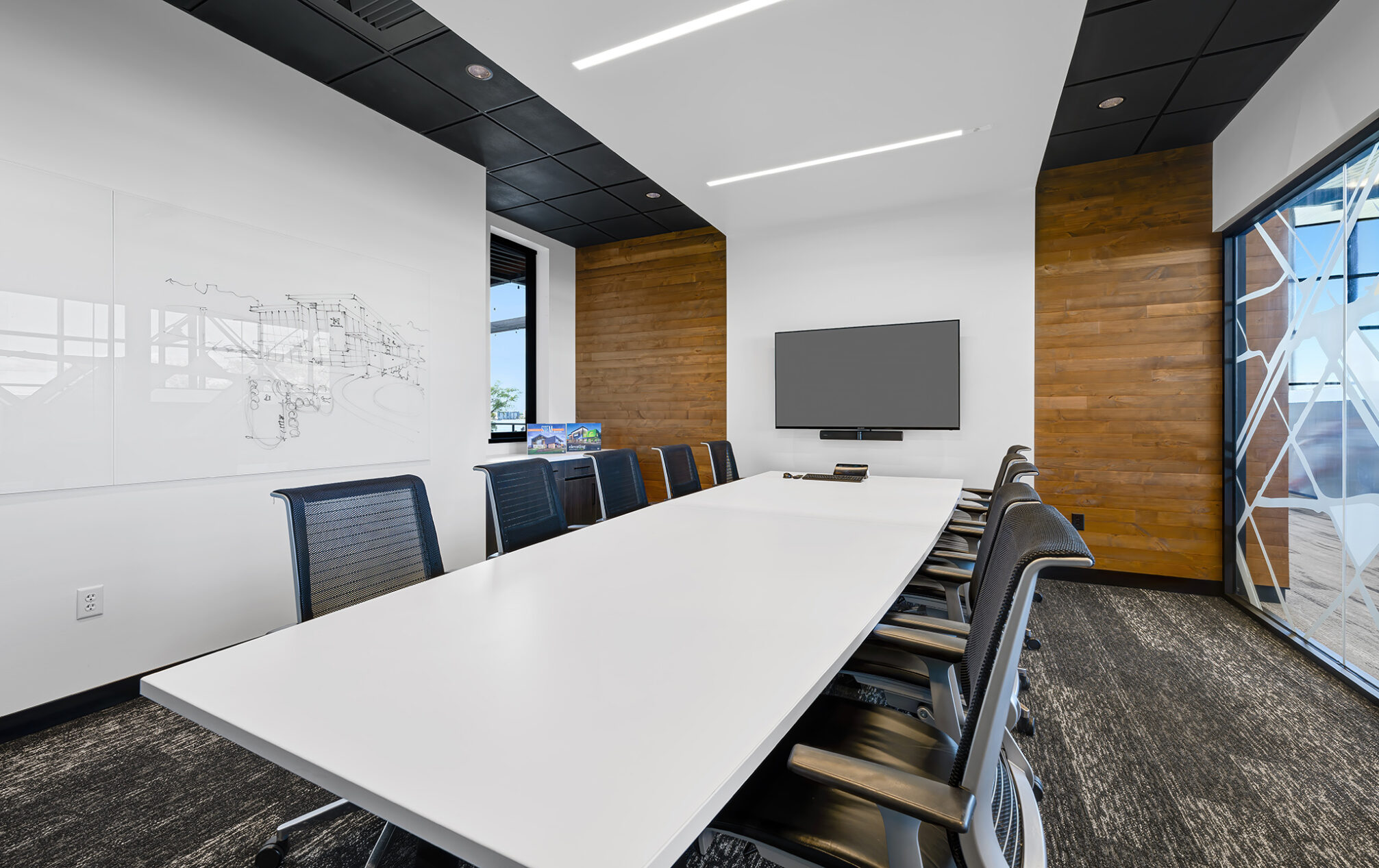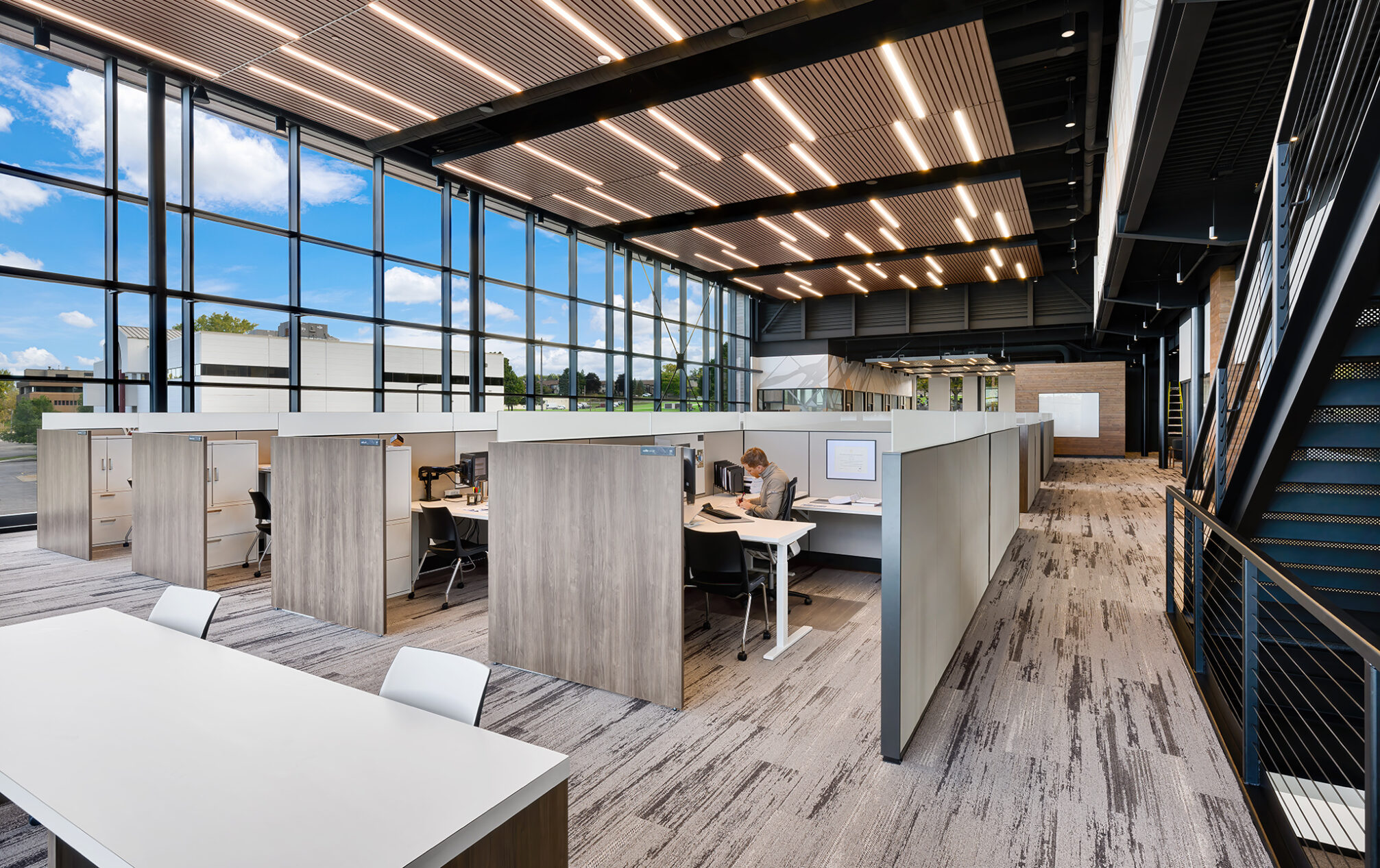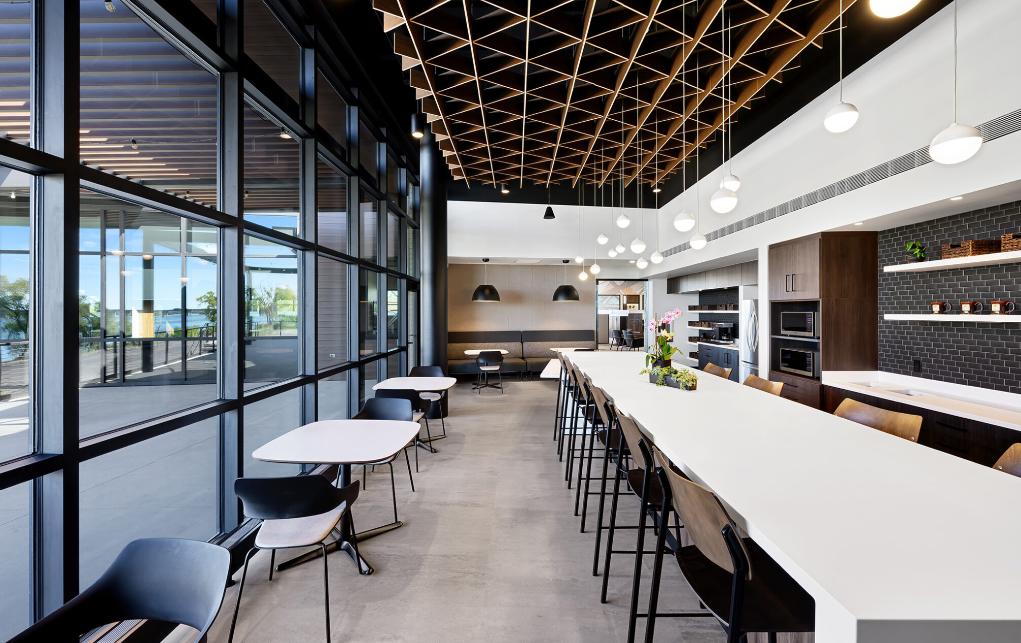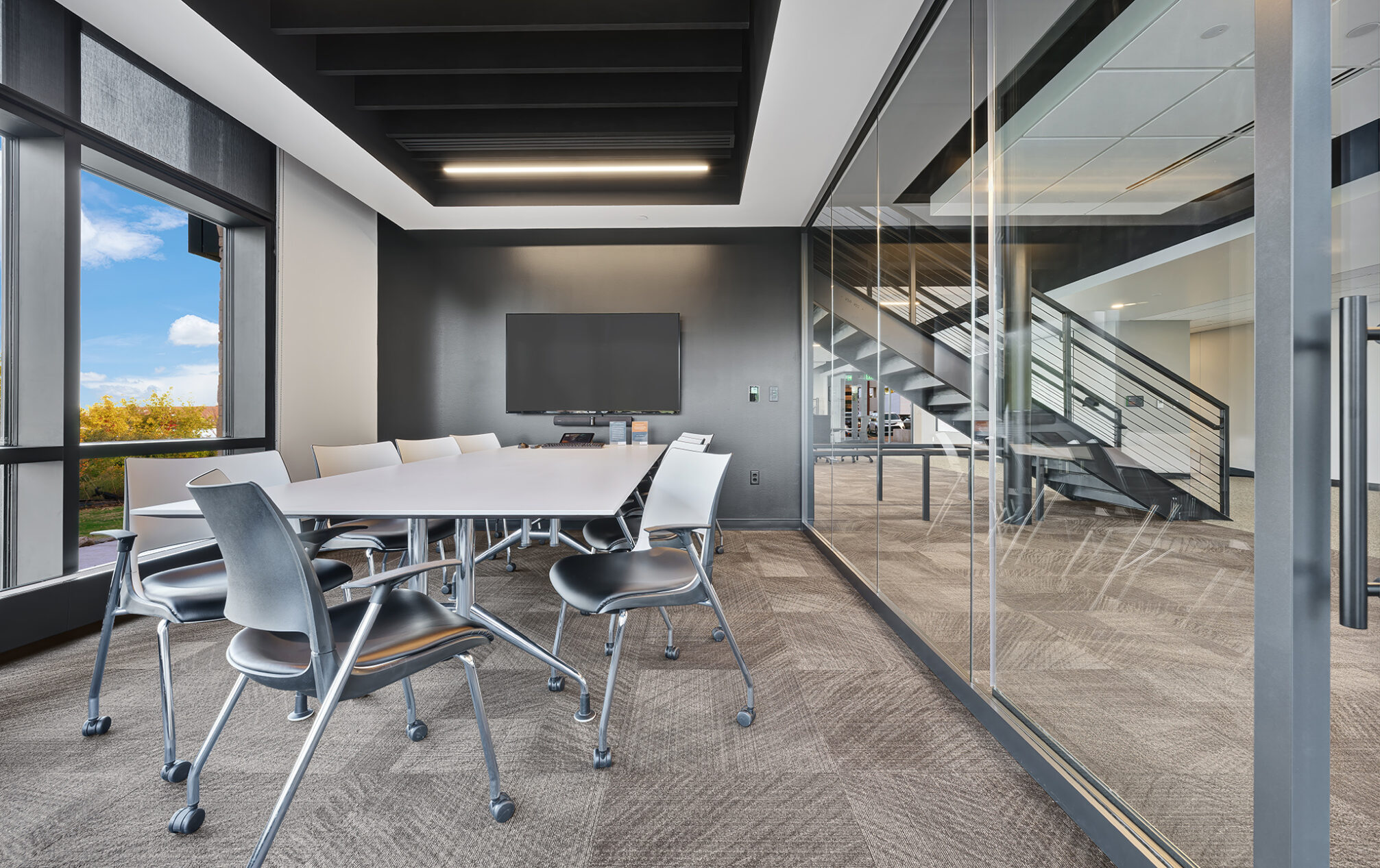 The design incorporates eight private meeting rooms and two large gathering spaces to facilitate communication and teamwork. The breakroom/café, with access to the outdoor terrace, offers a perfect spot for relaxation and informal meetings. A cozy fireplace with casual seating opportunities adds a touch of warmth and comfort to our workspace.