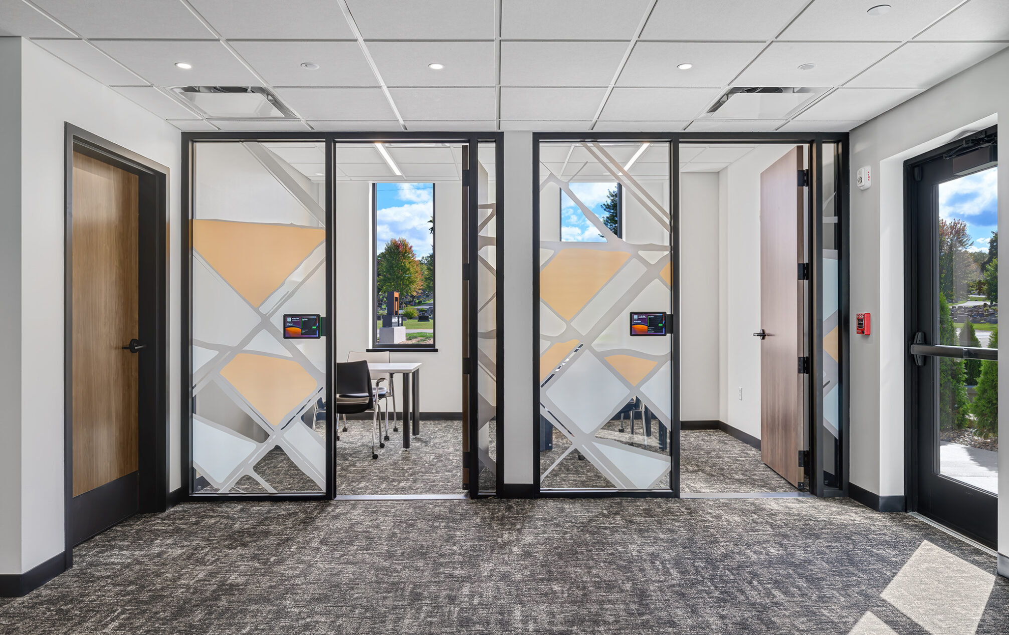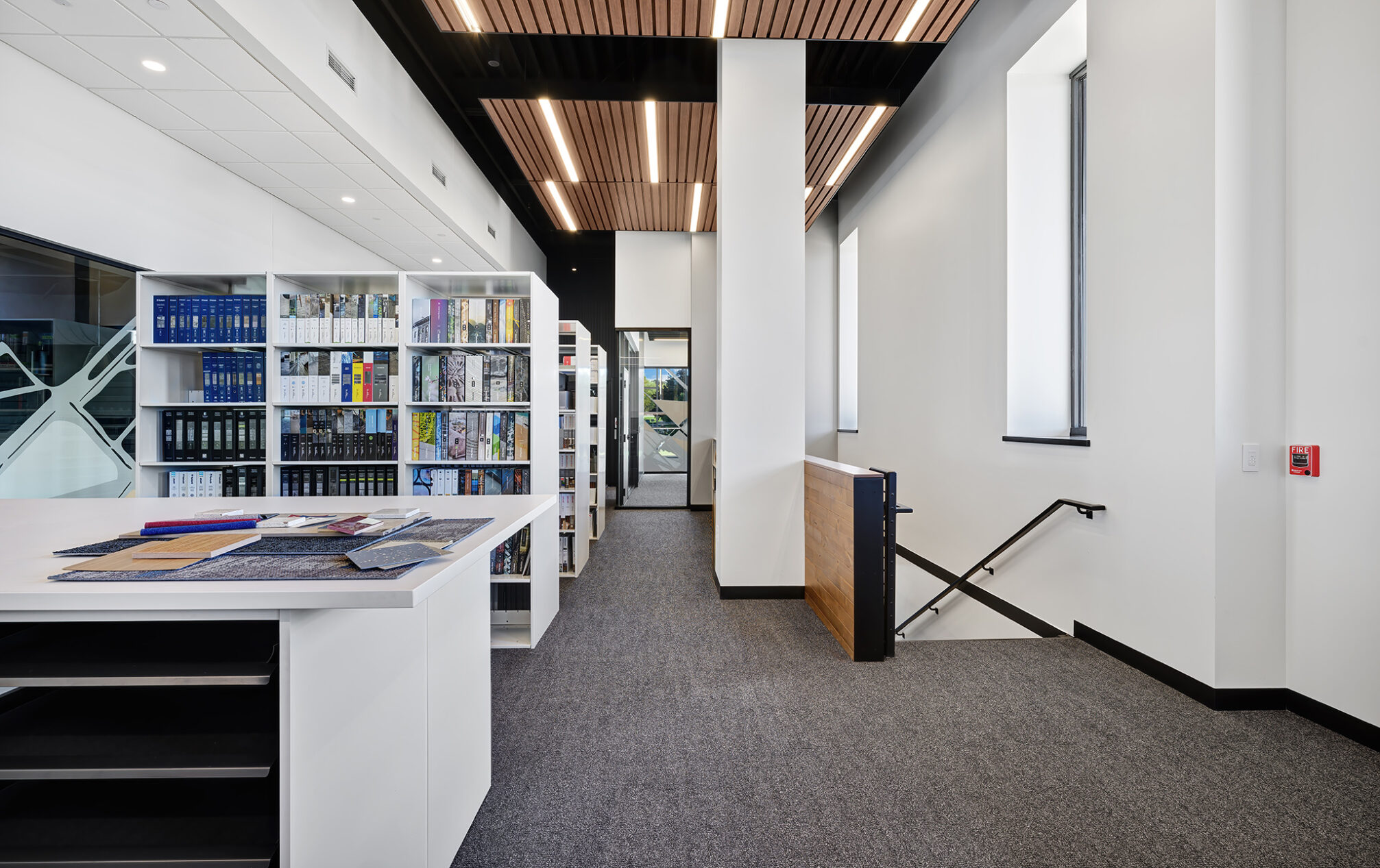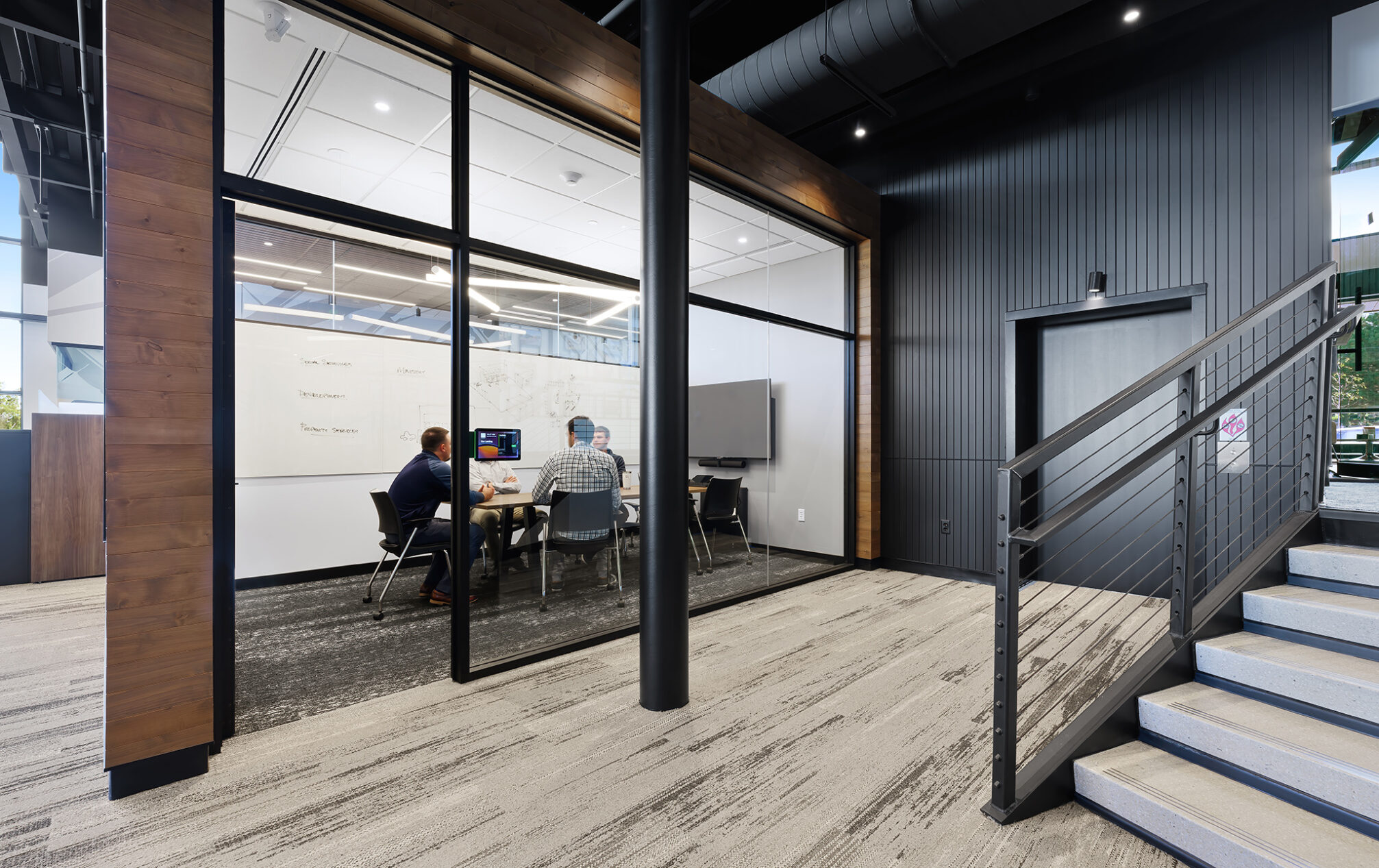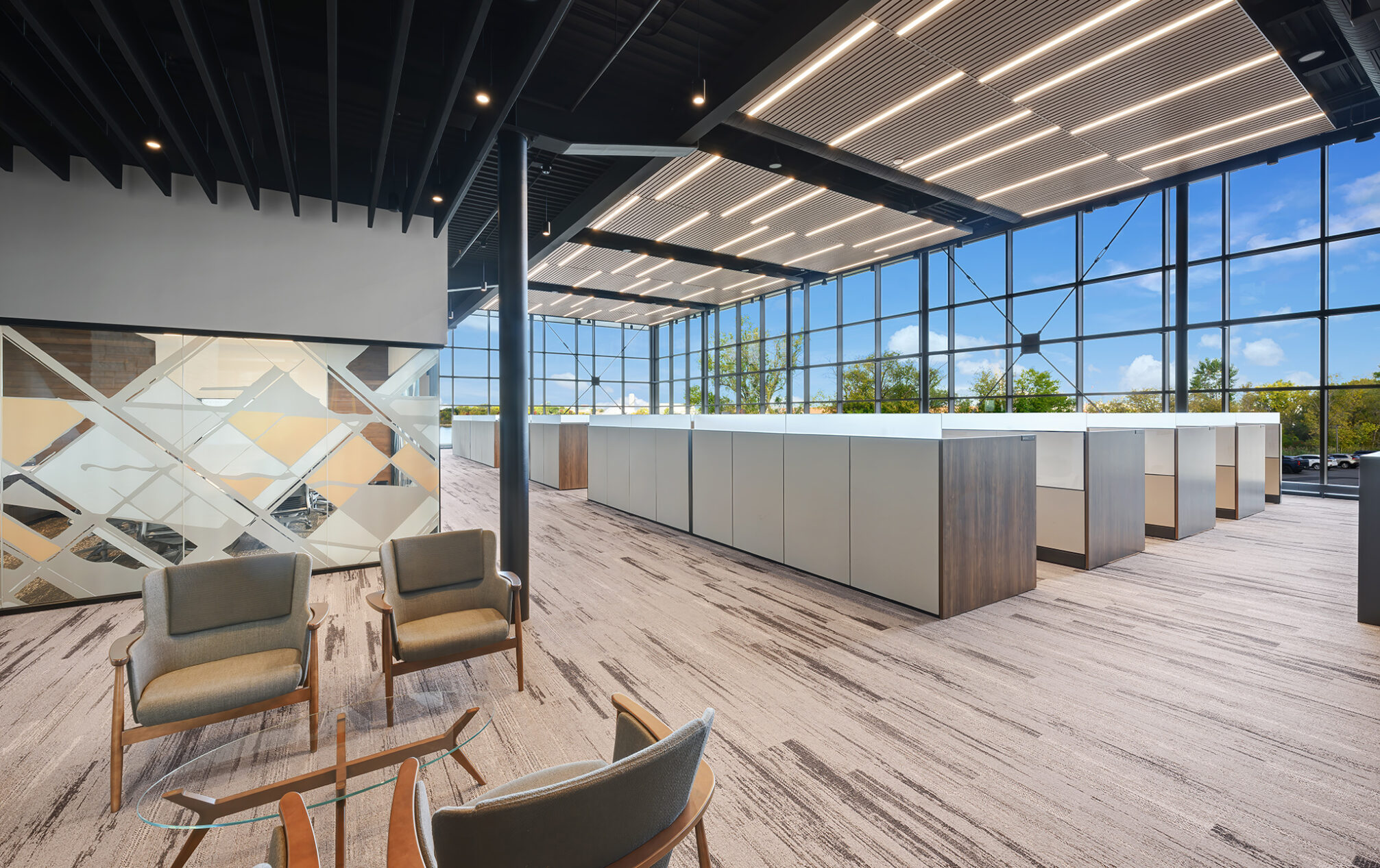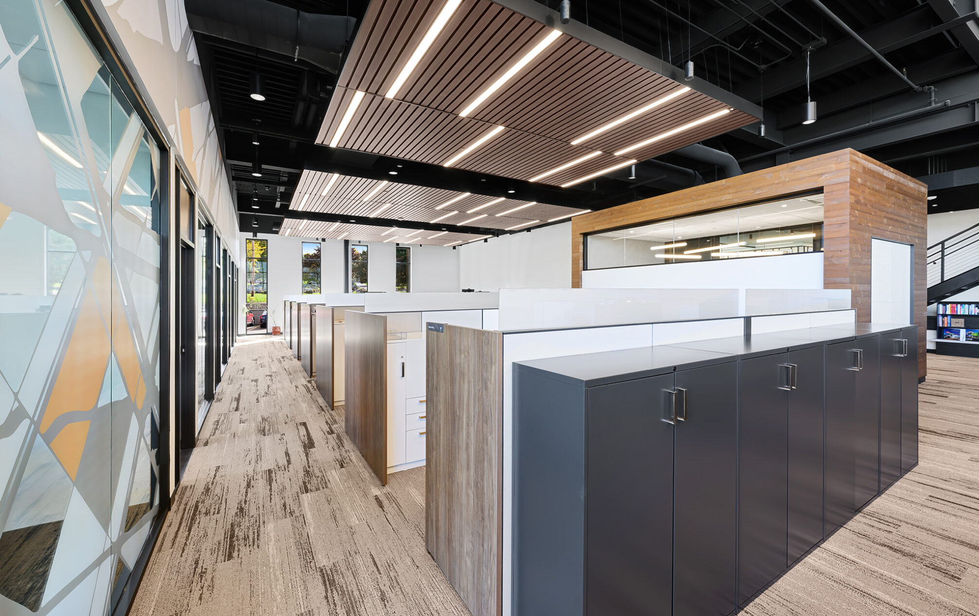 The design incorporates eight private meeting rooms and two large gathering spaces to facilitate communication and teamwork. The breakroom/café, with access to the outdoor terrace, offers a perfect spot for relaxation and informal meetings. A cozy fireplace with casual seating opportunities adds a touch of warmth and comfort to our workspace.
